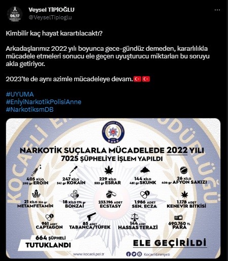 Konuya dair resmi sosyal medya hesabından açıklama yapan Kocaeli İl Emniyet Müdürü Veysel Tipioğlu, “Kim bilir kaç hayat karartılacaktı? Arkadaşlarımız 2022 yılı boyunca gece gündüz demeden kararlılıkla mücadele etmeleri sonucu ele geçen uyuşturucu miktarları bu soruyu akla getiriyor. 2023'te de aynı azimle mücadeleye devam” ifadelerini kullandı. İHA