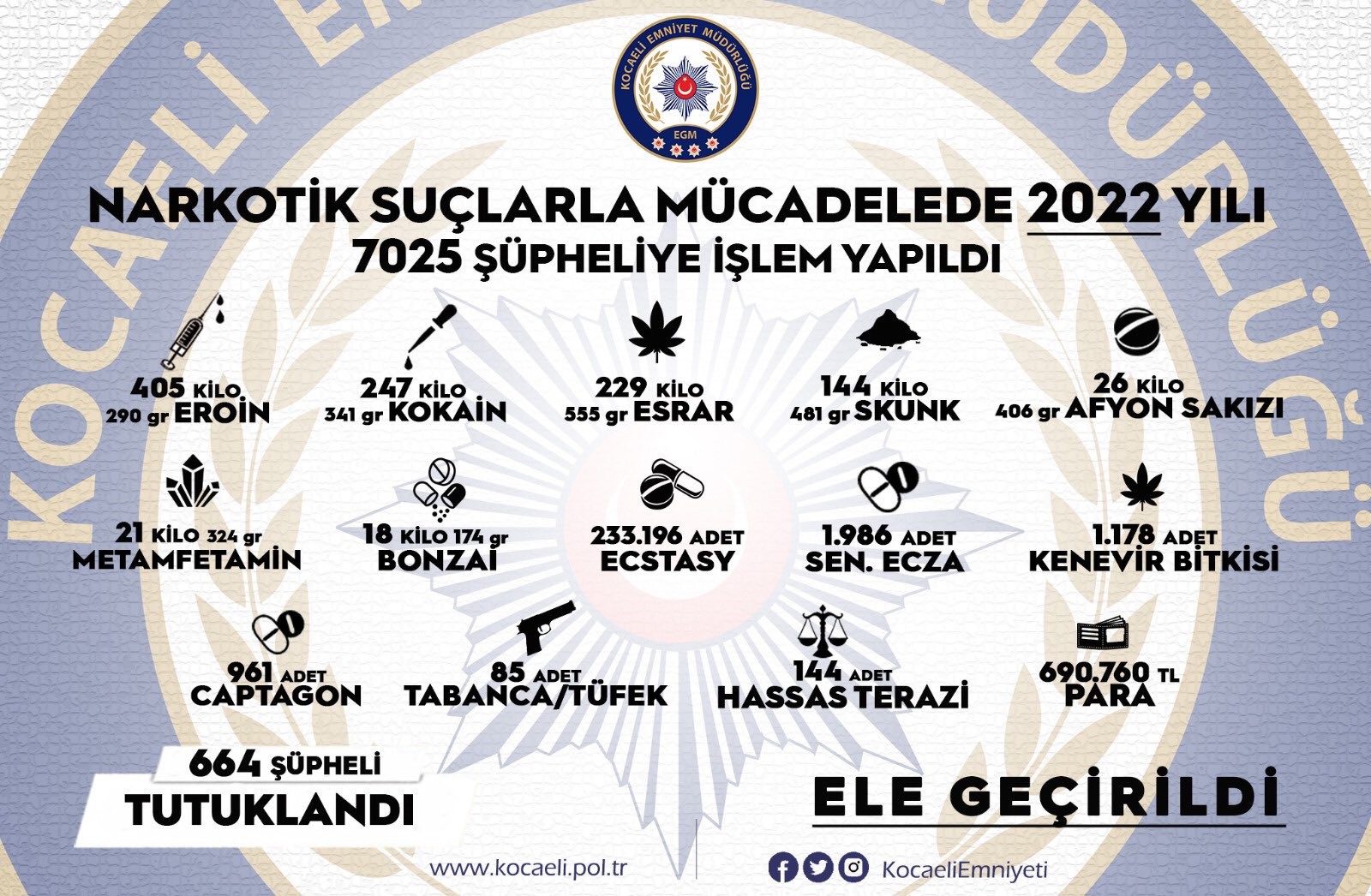 Kocaeli İl Emniyet Müdürlüğü’ne bağlı ekipler, 2022 yılında narkotik suçlarla mücadele çerçevesindeki çalışmalarında 405 kilo 290 gram eroin, 247 kilo 341 gram kokain, 229 kilo 555 gram esrar, 144 kilo 481 gram skunk, 26 kilo 406 gram afyon sakızı, 21 kilo 324 gram metamfetamin, 18 kilo 174 gram bonzai, 233 bin 196 ecstasy, bin 986 sentetik ecza, bin 178 kenevir bitkisi, 961 captagon, 85 tabanca/tüfek, 144 hassas terazi ve 690 bin 760 TL para ele geçirdi. 7 bin 25 şüpheli hakkında işlem yapılırken, şahısların 664'ü tutuklandı.
