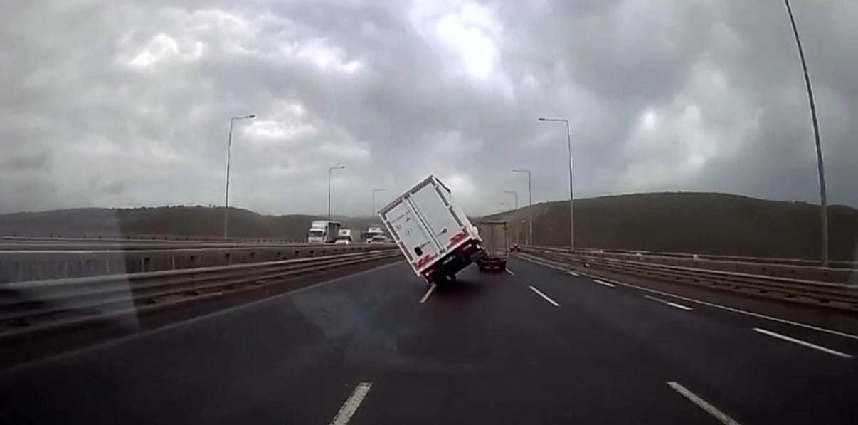 Kocaeli'de gece saatlerinden itibaren etkili olan fırtına, Kuzey Marmara Otoyolu'nda ulaşımda aksamalara yol açtı. Otoyolun Dilovası geçişinde seyir halinde olan iki tır ve kamyonet, şiddetli rüzgarın etkisiyle kontrolden çıkarak devrildi. Kazalarda şans eseri yaralanan olmazken, kamyonetin devrildiği anlar güvenlik kamerasına yansıdı. Görüntüde, kamyonetin devrildiği, seyir halindeki başka bir aracın da fırtına nedeniyle sallandığı görüldü. İHA