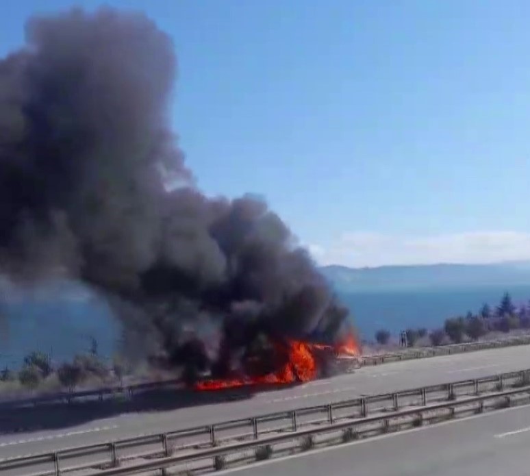 Dilovası D-100 Karayolu’nda seyir halinde olan kamyonetin lastiği patlayınca sürücü, aracını kenara çekti. Bir anda lastiğin alev alması neticesinde çıkan yangın kamyonetin tamamına sirayet etti