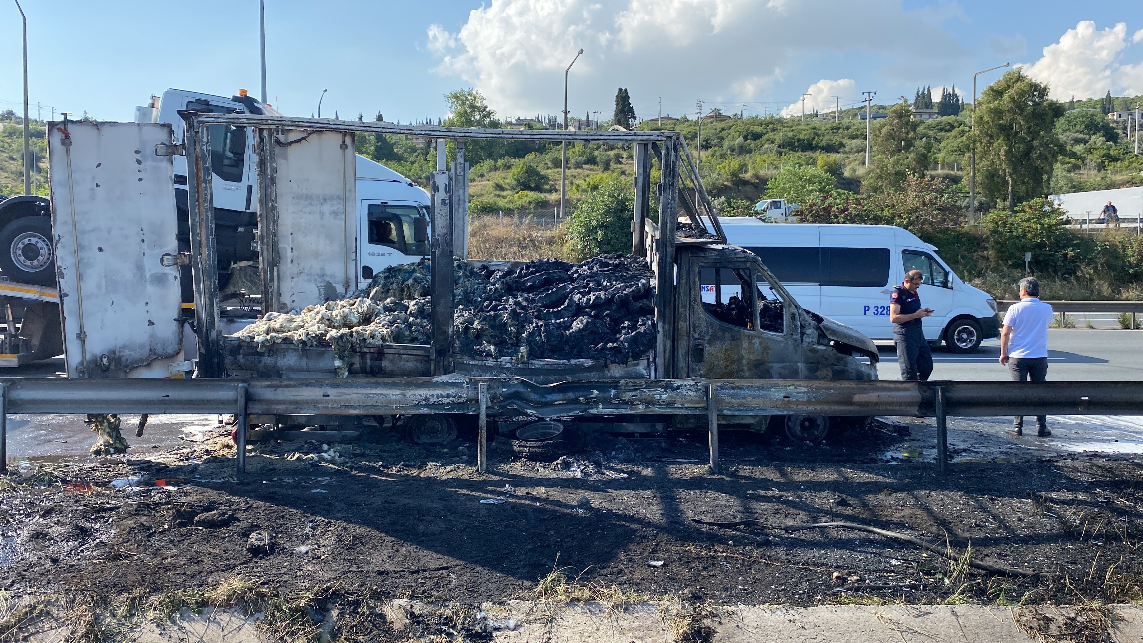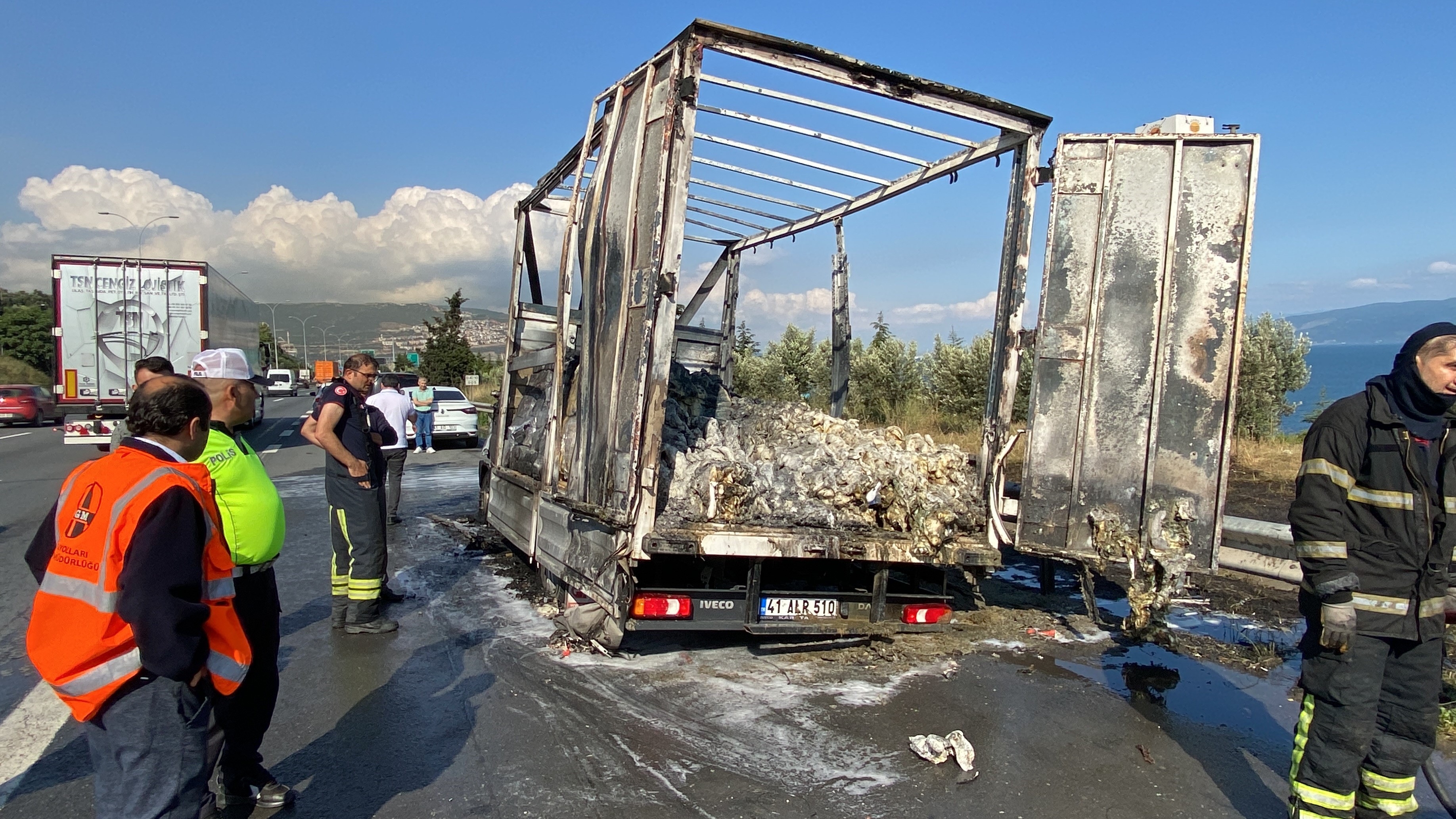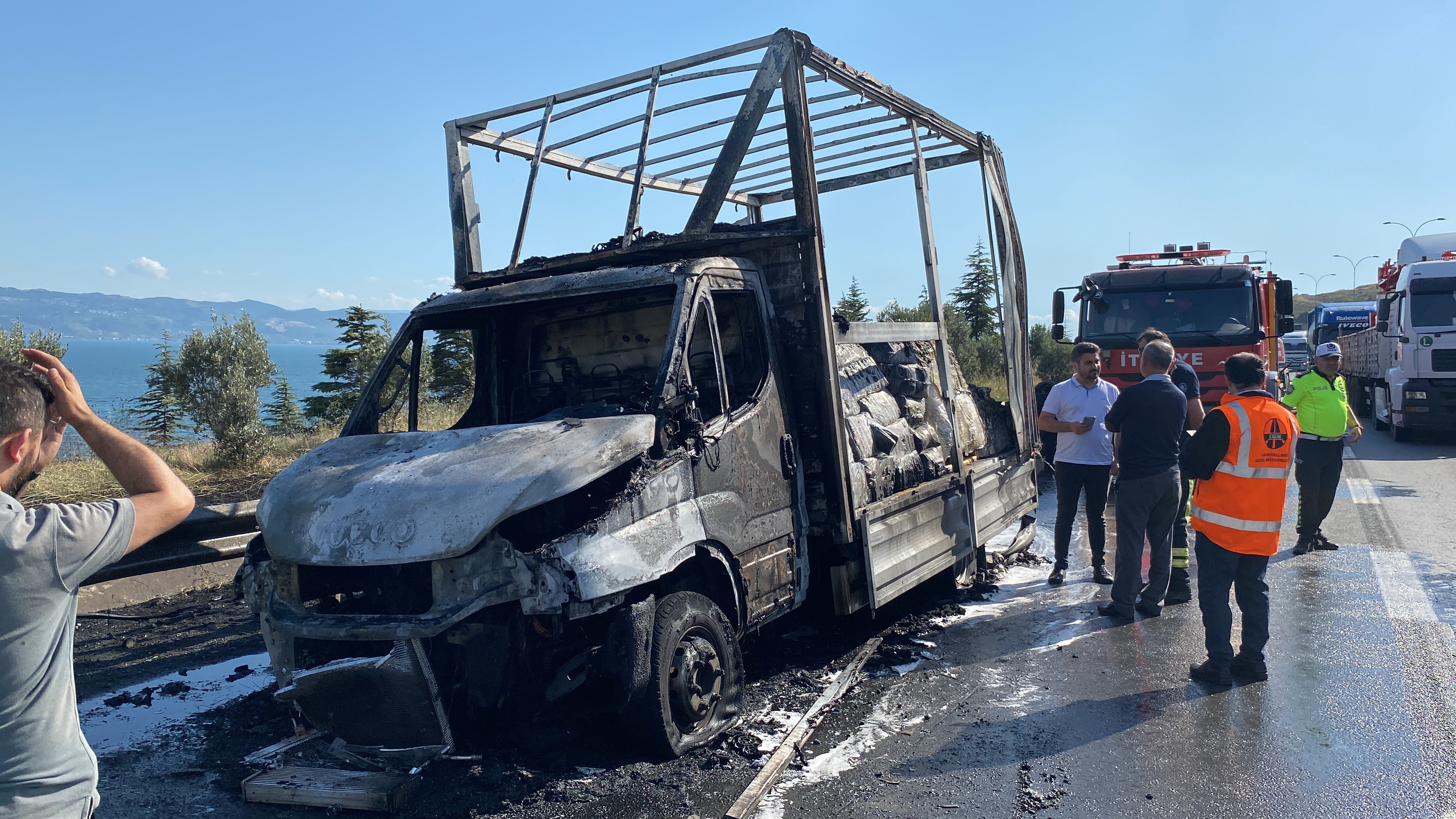 Kısa sürede olay yerine gelen itfaiye ekipleri, alev topuna dönen aracı söndürmek için çalışma başlattı. Ekiplerin çalışmasıyla yangın söndürülürken, araçtan geriye iskeleti kaldı. Olayda yaralanan olmazken polis inceleme başlattı. Yangının nasıl başladığını anlatan İbrahim Kader, "Seyir halindeyken sağ arka 2 lastiğim patladı. Aracı cebe çektim sonrasında lastik alev almaya başladı. Yangın söndürme tüpü ile müdahale ettim ama söndüremedim alevler büyüdü. İtfaiye gelip yangını söndürdü. İstanbul’dan gelip İzmit’e gidiyordum" dedi. İHA
