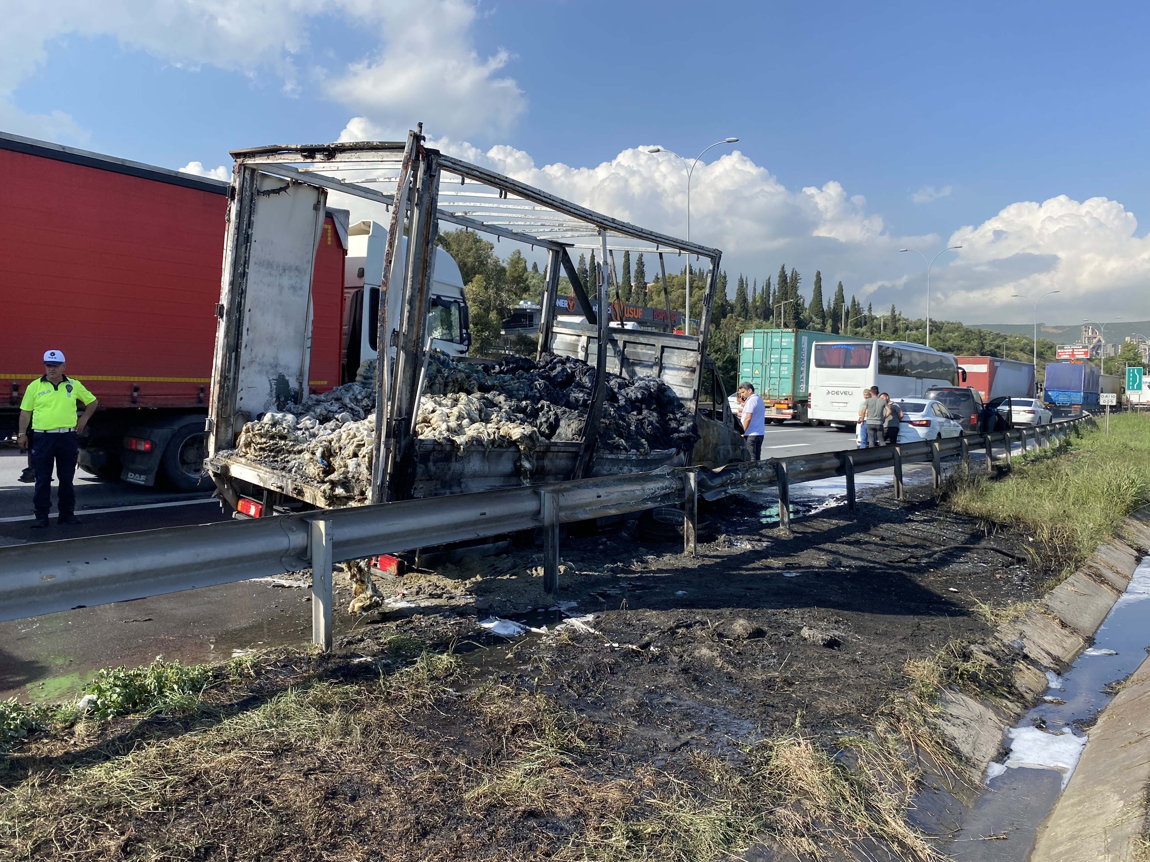 Yangın, Dilovası D-100 Karayolu Ankara istikameti Tavşancıl mevkiinde meydana geldi. Edinilen bilgiye göre, seyir halindeki 41 ALR 510 plakalı kapalı kasa kamyonetin lastiği patladı. Durumu fark eden sürücü, trafiği tehlikeye sokmamak için aracını kenara çekti. Sürücü araçtan inerken bu sefer de aracın lastiği alev aldı. Sürücü İbrahim Kader, yangın söndürme tüpüyle müdahale etmeye çalışsa da başarılı olamadı. Kısa sürede büyüyen yangın, poşet yüklü kamyonetin tamamına sıçradı. Dumanlar gökyüzünü siyaha bürürken ihbar üzerine olay yerine itfaiye ve polis ekipleri sevk edildi.