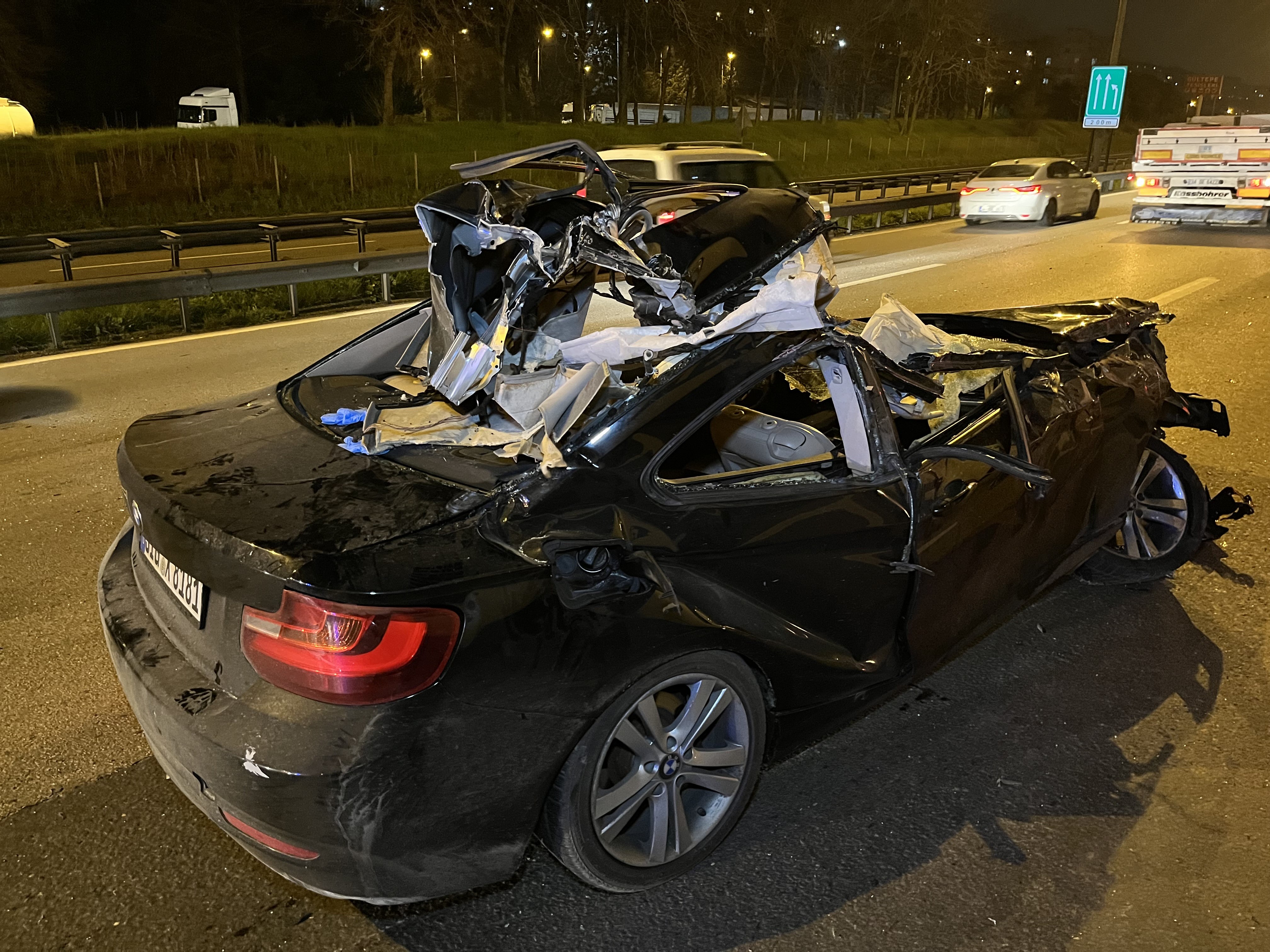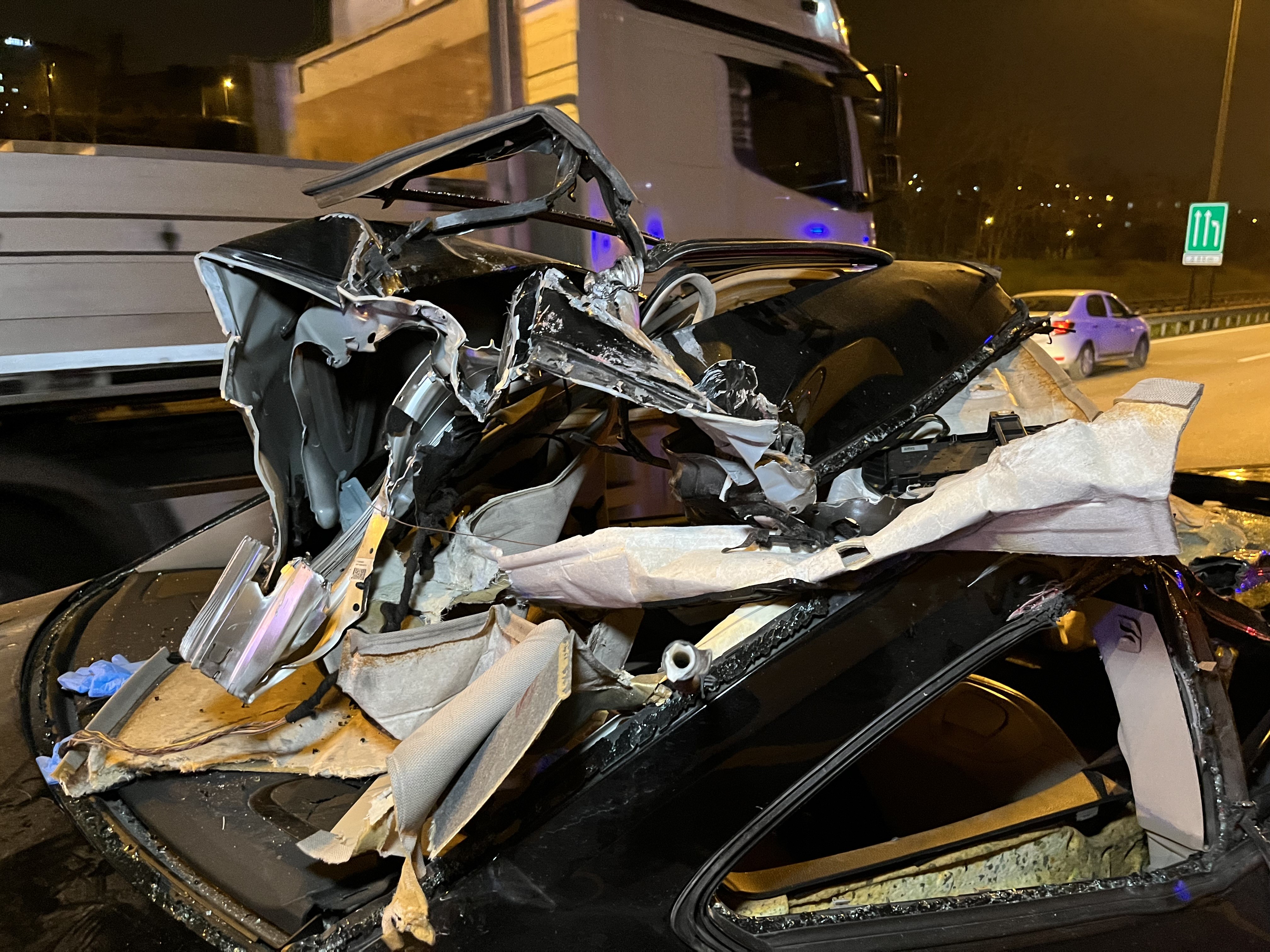 TEM Otoyolu’nun Kocaeli geçişinde tıra arkadan çarpan otomobilin tavanı koptu. Feci kazada 1 kişi öldü, 1’i ağır 2 kişi yaralandı. Olay yeri inceleme ekiplerinin yaptığı çalışmada otomobilde boş alkol şişeleri olduğu görüldü