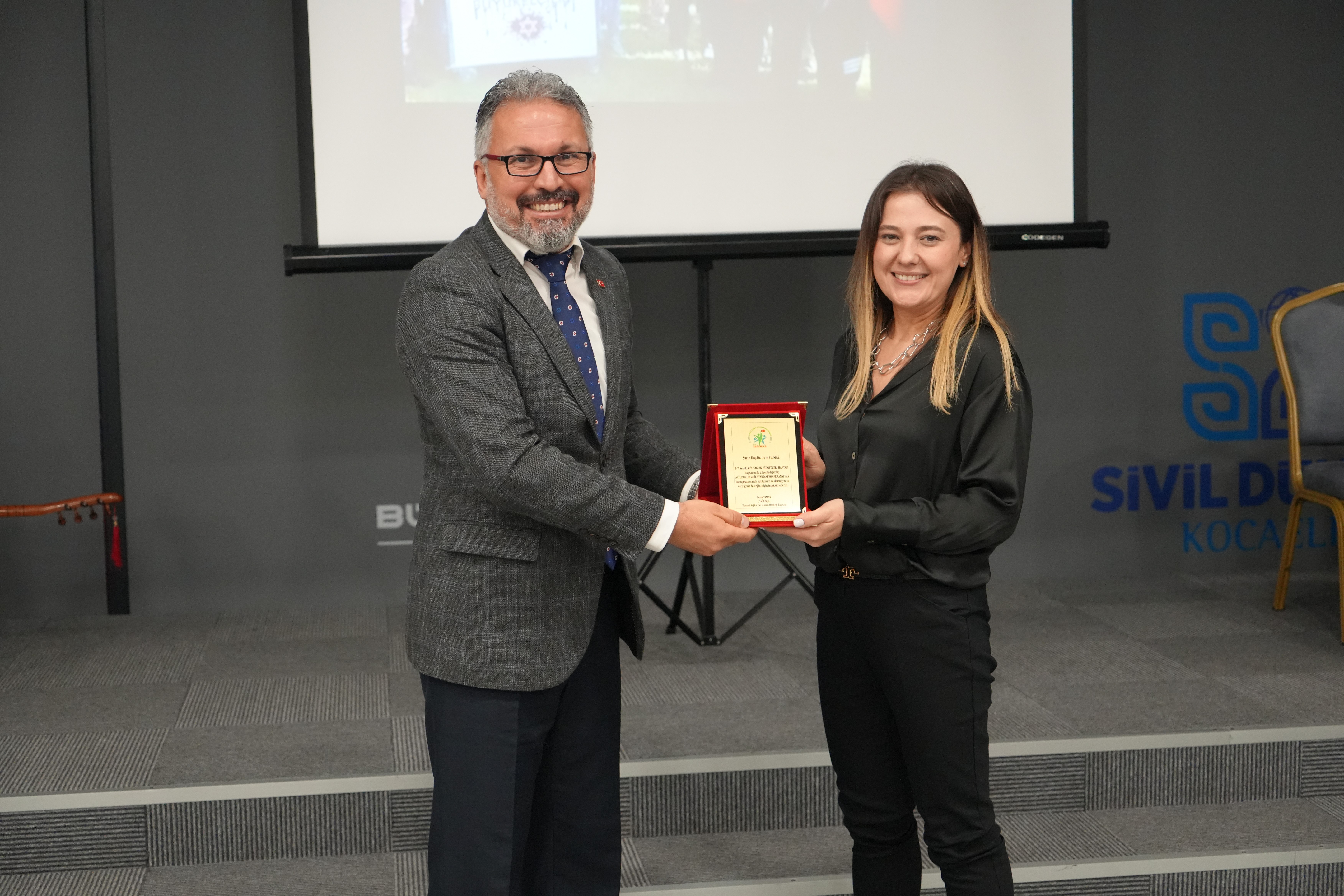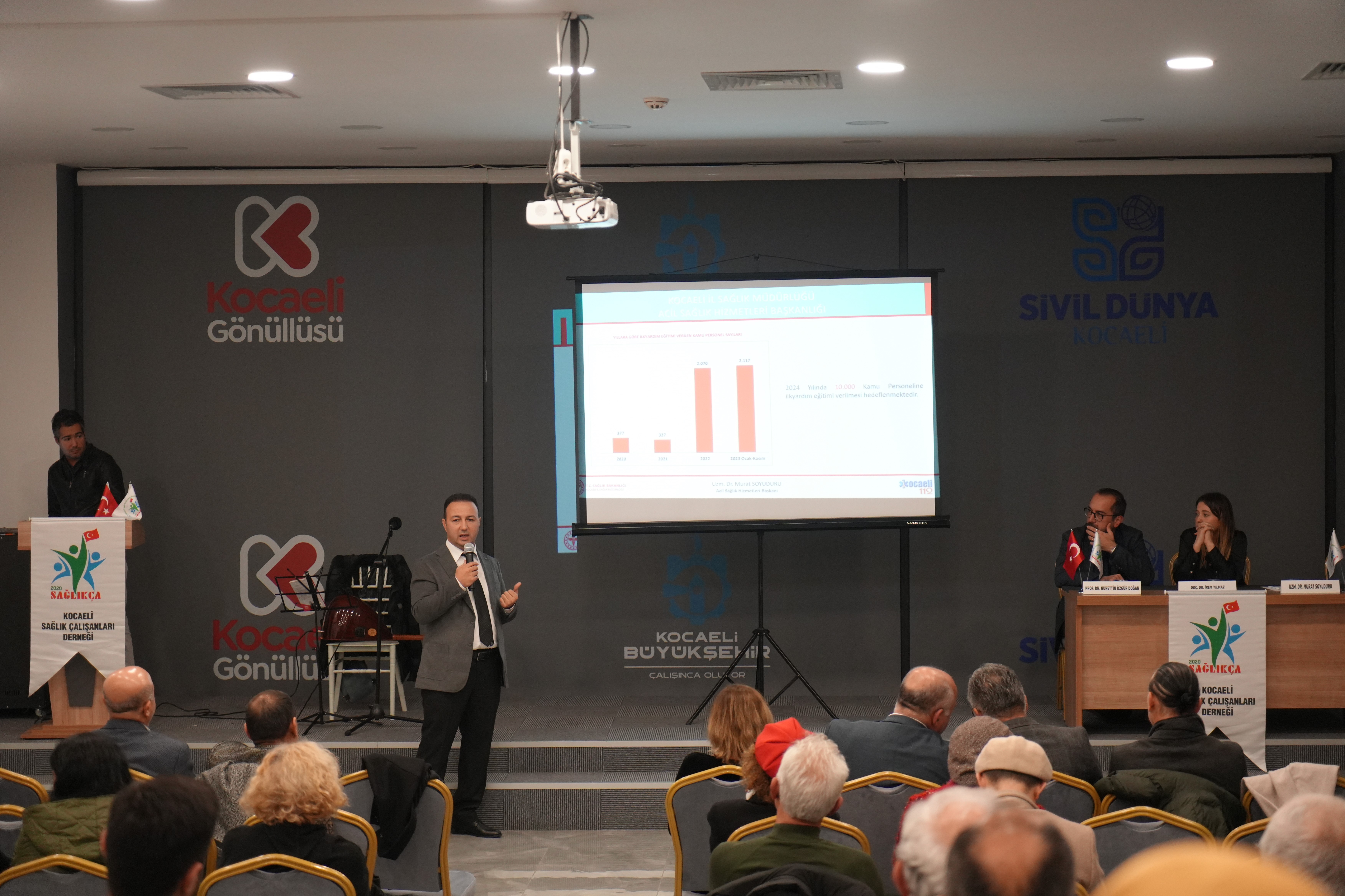 1-7 Aralık Acil Sağlık Hizmetleri Haftası dolayısıyla Kocaeli Sağlık Çalışanları Derneği ile Büyükşehir Belediyesi “Acil Durum ve İlk Yardım Konferansı” düzenledi. Konferans, Kocaeli Büyükşehir Belediyesi Sivil Toplum Merkezi salonunda gerçekleştirildi. Oturumda Acil Sağlık Hizmetleri Başkanı Uzm. Dr. Murat Soyuduru, "Acil Durum ve Acil Sağlık Hizmetlerinin Yaklaşımları", Kocaeli Üniversitesi Tıp Fakültesi Acil Tıp Anabilim Dalı Öğretim Üyesi Prof. Dr. Nurettin Özgür Doğan, "Acil Vakaların Ayrıştırılması ve Hastane Süreçleri", Kocaeli Üniversitesi Tıp Fakültesi Kardiyoloji Ana Bilim Dalı Öğretim Üyesi Doç. Dr. İrem Yılmaz ise "Kalp Krizi ve Müdahaleleri" başlıklı sunumlarını gerçekleştirdi. Vali Yardımcısı Ali Ada ve SAĞLIKÇA Derneği Başkanı Adem Yaman ise ilk yardımın önemine ilişkin konuşma yaptı. Daha sonra sunuma geçildi.