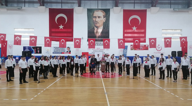 Programda ilk olarak Gençlik ve Spor İlçe Müdürü Hasan Ceyhan’ın Anıtpark’taki Atatürk Anıtı önüne çelenk sunumunda bulunmasının ardından bir dakikalık saygı duruşunda bulunuldu ve İstiklal Marşı’mız okundu. Çelenk sunma töreninin ardından 17 Ağustos Kapalı Spor Salonu’na geçildi ve Çakabey Anadolu Lisesi’nin hazırlamış olduğu programa burada devam edildi. Protokolün salondaki yerini almasının ardından başlayan programda ilk olarak saygı duruşunda bulunuldu ve İstiklal Marşı’mız okundu.