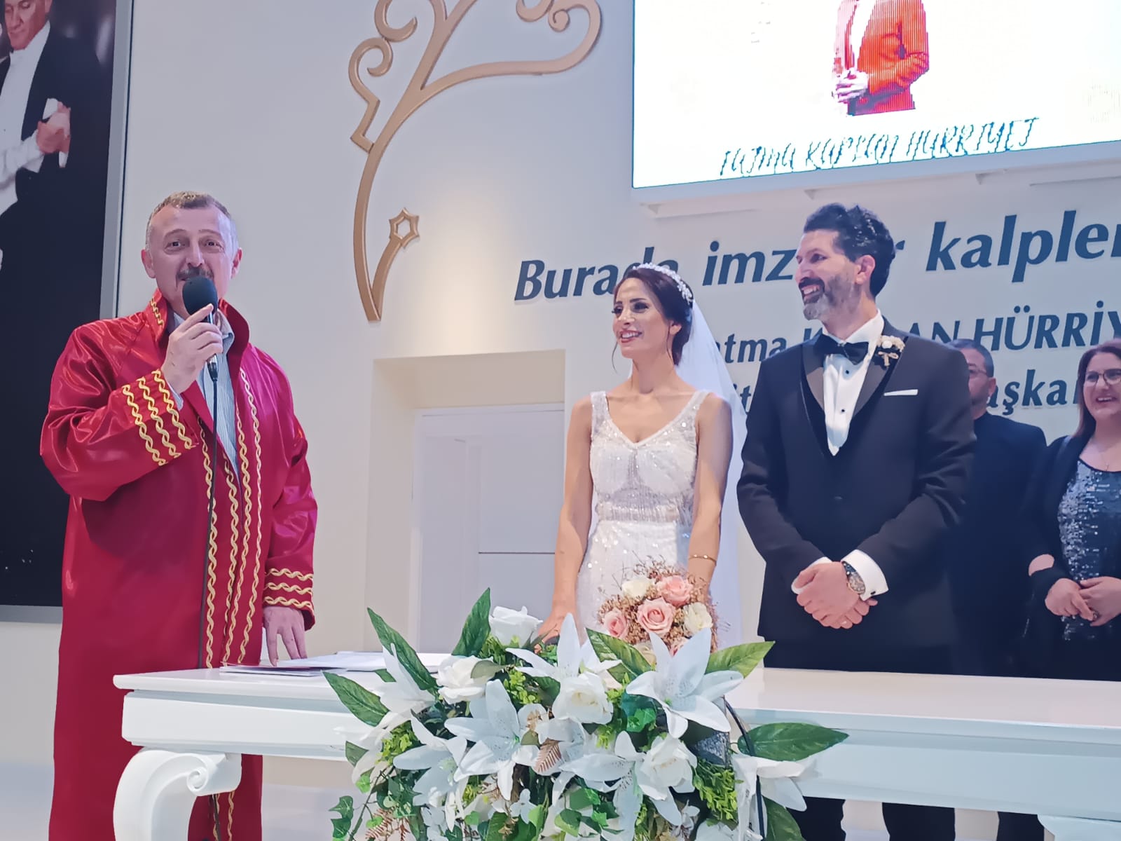 Kocaeli Büyükşehir Belediye Başkanı Tahir Büyükakın'ın kıydığı nikahta çiftin nikah şahitliklerini Kandıra Belediye Başkanı Adnan Turan, AK Parti İl Başkanı Şahin Talus, KOÜ Araştırma ve Uygulama Hastanesi Üroloji Bölümü Anabilim Dalı Başkanı Cüneyt Özkürkçügil, Kocaeli Gazeteciler Cemiyeti Başkanı Cemal Kaplan, KOGACE Yönetim Kurulu Üyesi Hüseyin Öziri, AK Parti İzmit İlçe Başkanı Muharrem Tutuş, Gazeteci Şennur Yıldız ve Yasemin Kaya yaptı.