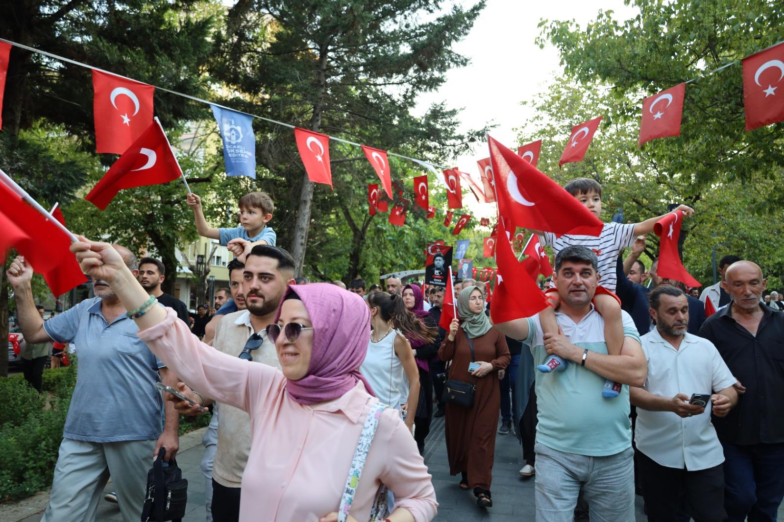 Kocaeli Valiliği, Kocaeli Büyükşehir Belediyesi ve sivil toplum kuruluşlarının 15 Temmuz dolayısıyla birlikte düzenlediği “Zaferin Adı Türkiye” yürüyüşü gerçekleştirildi. Binlerce Kocaelili 9 yıl önce olduğu gibi 15 Temmuz heyecanını kaybetmediklerini gösterdi