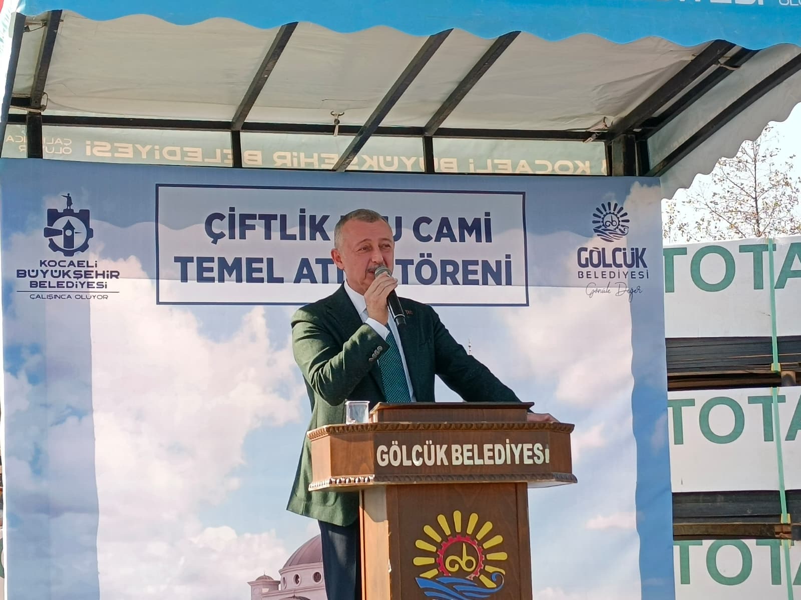 Akabinde konuşan Gölcük Belediye Başkanı Ali Yıldırım Sezer, “Böyle güzel, hayırlı bir iş için Cenab-ı Mevla’m bizleri buraya toplanmaya nasip etti. Allah'a hamdolsun. Daha önce uzun yıllar şehrimizin ibadet edildiği Çiftlik Ulu Camimiz vardı. Bununla alakalı olarak performans analizi yapıldığında göçme riski belirlendi. Hızlıca bu konuda ne yapabiliriz diye hem mahalle sakinlerimizle oturduk istişare ettik. Dernek yönetimimizle oturduk konuştuk ve şu an az sonra temelini atacağımız cami ile alakalı hızlıca çalışmayı gerçekleştirdik. Bu inşaat süresince de vatandaşlarımızın ibadetlerini yapmaları açısından hemen arkamızda bulunan mescidin şadırvanı, lavabosunu ve çay ocağını yaptık ve vatandaşlarımızın kullanımına açtık” dedi.