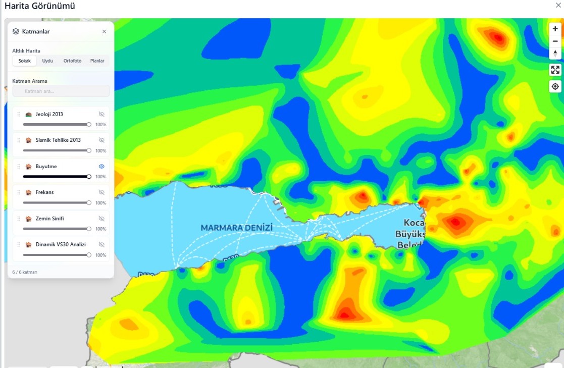 Afetlere karşı hazırlık çalışmalarını kararlılıkla sürdüren Kocaeli Büyükşehir Belediyesi, projeyi İmar ve Şehircilik Dairesi Başkanlığı’na bağlı Zemin Deprem İnceleme Şube Müdürlüğü aracılığıyla yürütüyor. Belediyelere ait zemin etüt raporlarının yanı sıra Maden Tetkik ve Arama Genel Müdürlüğü (MTA) başta olmak üzere ilgili kurumlardan temin edilen veriler dijital ortama aktarılıyor. Sıvılaşma potansiyeli, heyelan riski ve fay hatlarına ilişkin kritik haritalar da sistemde yer alıyor.