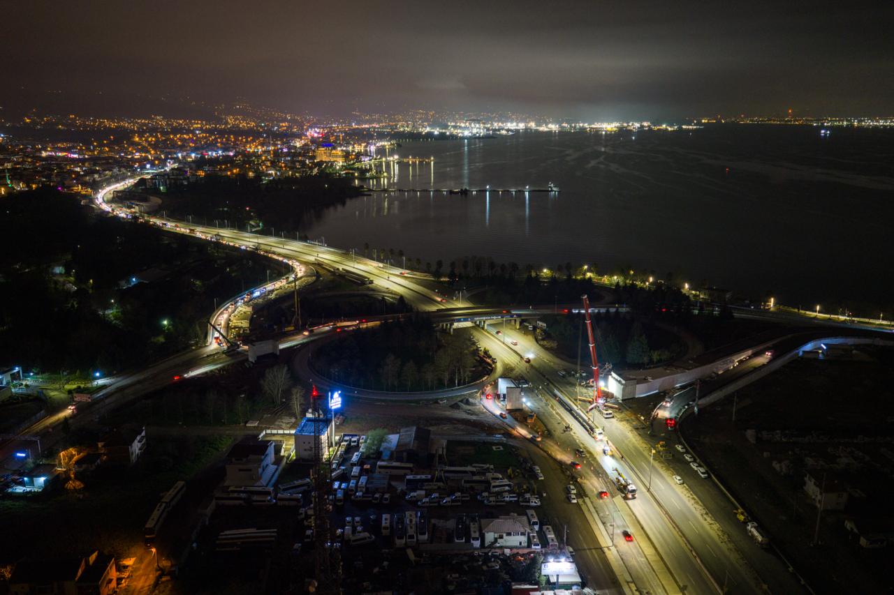 Kocaeli Büyükşehir Belediyesi kentin dört bir yanında dev projeler hayata geçirirken, ekipler gece mesaisi de yapıyor. Başiskele Kavşağı Koridor Projesi kapsamında D-130 Karayolu ile Ömer Türkçakal Bulvarı bağlantısını sağlayacak direksiyonel kavşağın devasa kirişlerinin montajı da gece saatlerinde gerçekleştirildi. Ekipler, trafiğin aksatılmaması için montaj çalışmalarına saat 01.30’da başladı.
