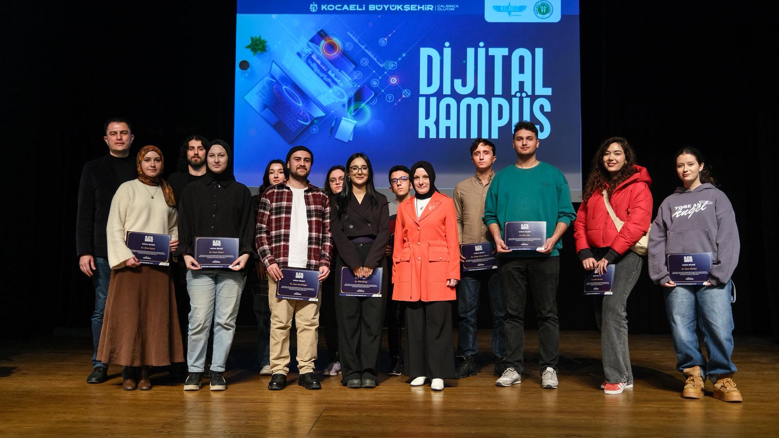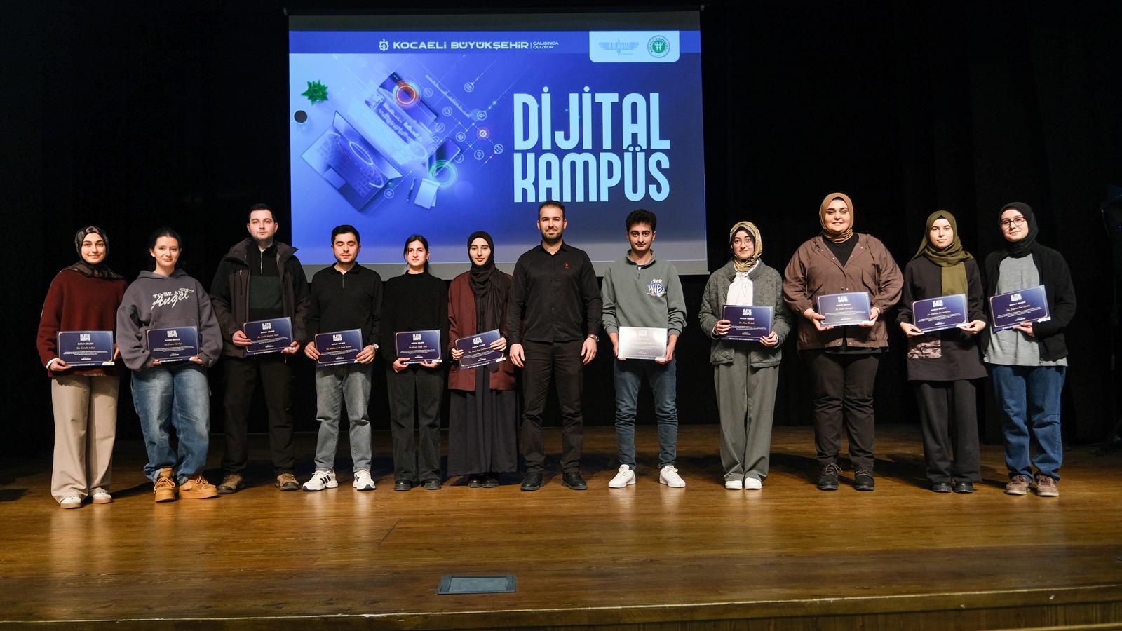 Gençlik ve Spor Hizmetleri Dairesi Başkanlığı Bilim, Teknoloji ve İnovasyon Şube Müdürü Mine Pir Kazan ise, “Dijital Kampüs’te üreten gençler, bugün emeklerini sertifikayla taçlandırıyor. Dijital gelişiminize önem verdiğiniz için buradasınız ve eğitim programımızdan mezun olmayı hak ettiniz. Tüm öğrencilerimizi tebrik ediyorum. Kocaeli’de üniversite öğrencisi olmak ayrı bir şanstır. Kocaeli Büyükşehir Belediye Başkanımız bildiğiniz üzere akademisyen olduğu için gençlerin eğitimi ve dijital gelişimlerinin desteklenmesine çok önem veren bir vizyona sahip. Biz de bu vizyonu sizlere ulaştırmak için çalışan ekip arkadaşlarıyız. Kocaeli’de öğrenci olmanın bir diğer avantajı da Kocaeli Büyükşehir Belediyesi ve Kocaeli Üniversitesi arasındaki uyumdur. Her iki kurumun bu kadar uyumlu çalışması her şehir de mümkün olmayabilir. Bu imkânın içerisinde olduğunuz için kendinizi şanslı hissedebilirsiniz. Yolunuz bahtınız açık olsun” ifadelerini kullandı. Konuşmaların ardından 235 öğrenciye sertifikaları törenle takdim edildi.