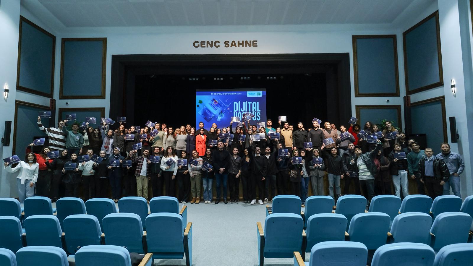 Kocaeli Büyükşehir Belediyesi ve Kocaeli Üniversitesi Sürekli Eğitim Merkezi işbirliğiyle yürütülen “Dijital Kampüs Eğitim Programları” kapsamında eğitimlerini başarıyla tamamlayan 235 genç katılımcı, Halkevi Gençlik Merkezi’nde gerçekleştirilen törenle sertifikalarını aldı