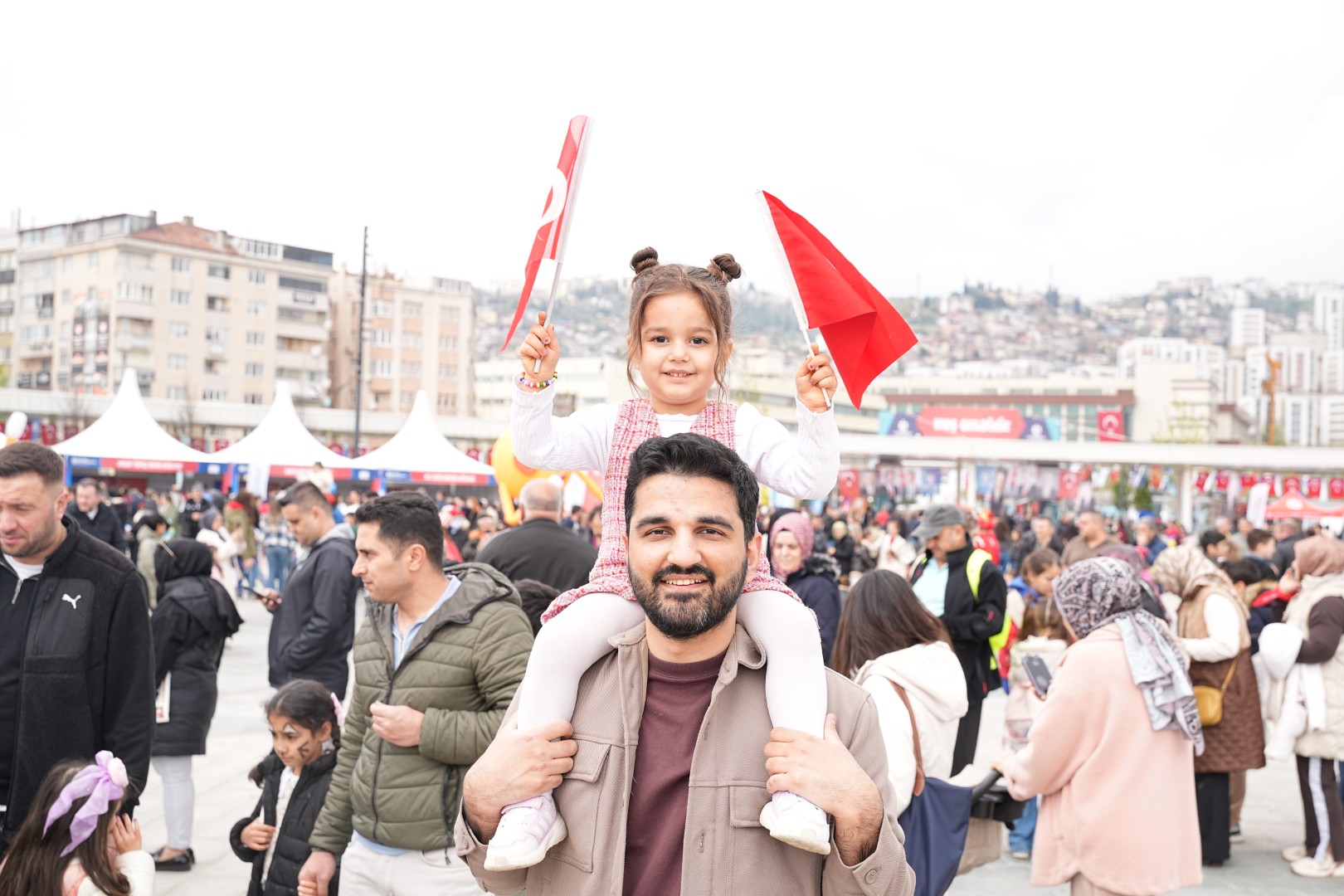 Kocaeli Büyükşehir Belediyesi’nin Milli İrade Meydanı’nda kurduğu 23 Nisan etkinlik alanı, minikler ve ailelerinin yoğun katılımıyla bayram coşkusunu zirveye taşıdı. Anne ve babalarının ellerinden tutan çocuklar, şenlik alanına gelerek günün tadını çıkardı
