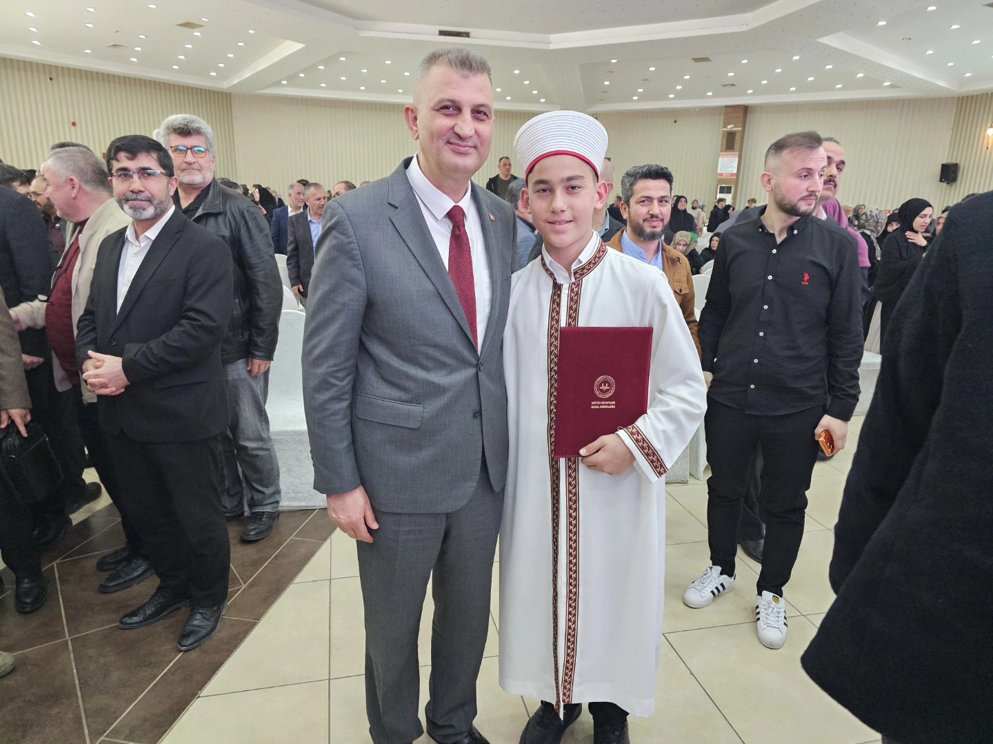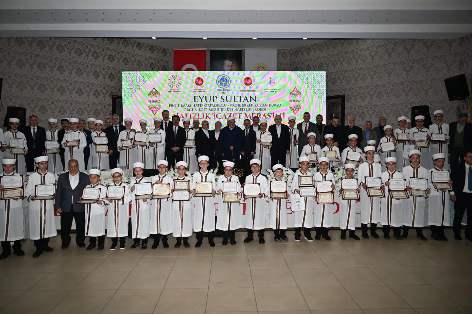 Gölcük Eyüp Sultan İmam Hatip Ortaokulu ve Proje Erkek Kuran Kursu’nda öğrenim görerek hafızlığını tamamlayan 41 öğrenci, Gölcük Belediyesi Kongre Sarayı’nda protokolün katılımı ile gerçekleşen programda icazetlerini aldı