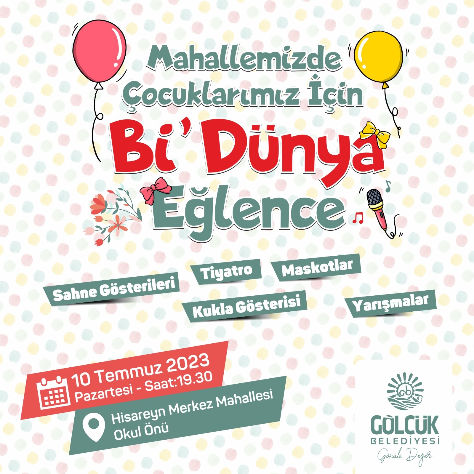 Gölcük Belediyesi’nin kültür-sanat etkinlikleri kapsamında düzenleyeceği çocuklara eğlence dolu günler yaşatacak ‘Mahallemizde Çocuklar İçin Bi’Dünya Eğlence’ etkinlikleri, bugün başlıyor