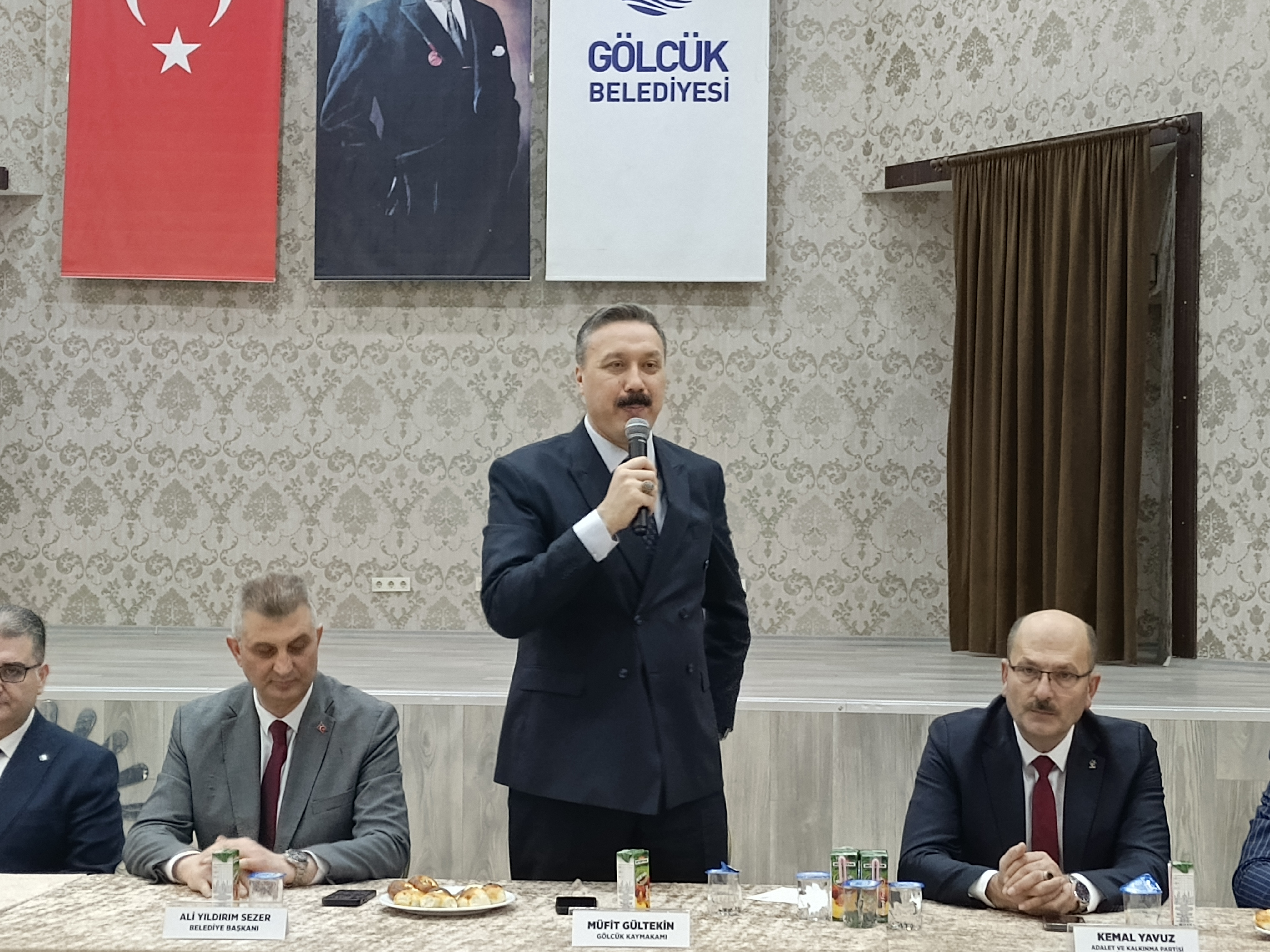 Gölcük Kaymakamı Müfit Gültekin, konuşmasında “Hepinizin Ramazan Bayramı’nı canı gönülden kutluyorum. 30 gün boyunca Ramazan’ın o manevi ikliminin bugün bayram havasında şu güzel salon içerisinde hep birlikte, başkanımızın da ifade ettiği gibi etrafımız ateş çemberi ama biz bu ülkede huzur, mutluluk ve refah içerisinde böyle güzel bayramlar kutluyorsak bunun birçok sebebi var. O yüzden devlet yetkililerimize, ordumuza ve bütün vatandaşlarımıza, bizi biz yapan milli ve manevi değerlerimize sahip çıkmanın mutluluğu ve huzuruyla oluyor. Cenabı Allah nice böyle sevinçli ve mutlu bayramları hep beraber ebede kadar bu İslam beldelerinde bayramların devam etmesini nasip etsin. Siz kıymetli misafirlerimizin de ailelerinizle beraber huzurlu nice bayramlarınız olsun, her bir günümüz bayram kadar sevinçli olsun. Şairin dediği gibi; “Hüzn ü keder def' ola, dilde hicab ref’ ola, cümle günâh af ola, bayram o bayram ola” diyerek hepinizin bayramını kutluyorum” diyerek konuşmalarını tamamladı. Konuşmaların ardından kent bayramlaşmasına gelen katılımcılar protokol ile bayramlaştı ve Gölcük Belediyesi Kongre Sarayı önünde çekilen anı fotoğrafı ile program tamamlandı. Meltem ALKAN
