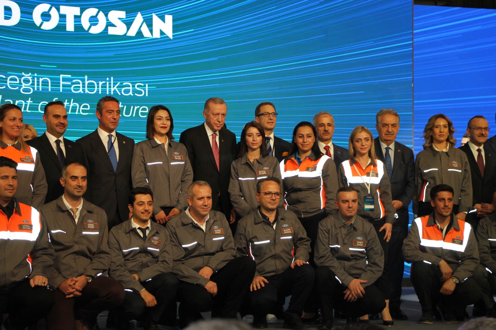 Törene Cumhurbaşkanı Erdoğan'ın yanı sıra; Sanayi ve Teknoloji Bakanı Mehmet Fatih Kacır, Kocaeli Valisi Seddar Yavuz, AK Parti Kocaeli Milletvekilleri Veysel Tipioğlu, Sami Çakır, Radiye Sezer Katırcıoğlu, Sadettin Hülagü, AK Parti MKYK üyesi İlyas Şeker, eski Bakan Fikri Işık, Büyükşehir Belediye Başkanı Tahir Büyükakın, ilçe belediye başkanları, AK Parti Kocaeli İl Başkanı Şahin Talus, Koç Holding Yönetim Kurulu Başkanvekili ve Ford Otosan Yönetim Kurulu Başkanı Ali Koç, Koç Holding Yönetim Kurulu Başkanı Ömer Koç, Ford Pro Avrupa Başkanı Hans Schep, Koç Holding CEO’su Levent Çakıroğlu, Koç Holding Otomotiv Grubu Başkanı Haydar Yenigün, Ford Otosan Genel Müdürü Güven Özyurt, Ford Otosan Genel Müdür Baş Yardımcısı Josephine Payn ve fabrika çalışanları katıldı.