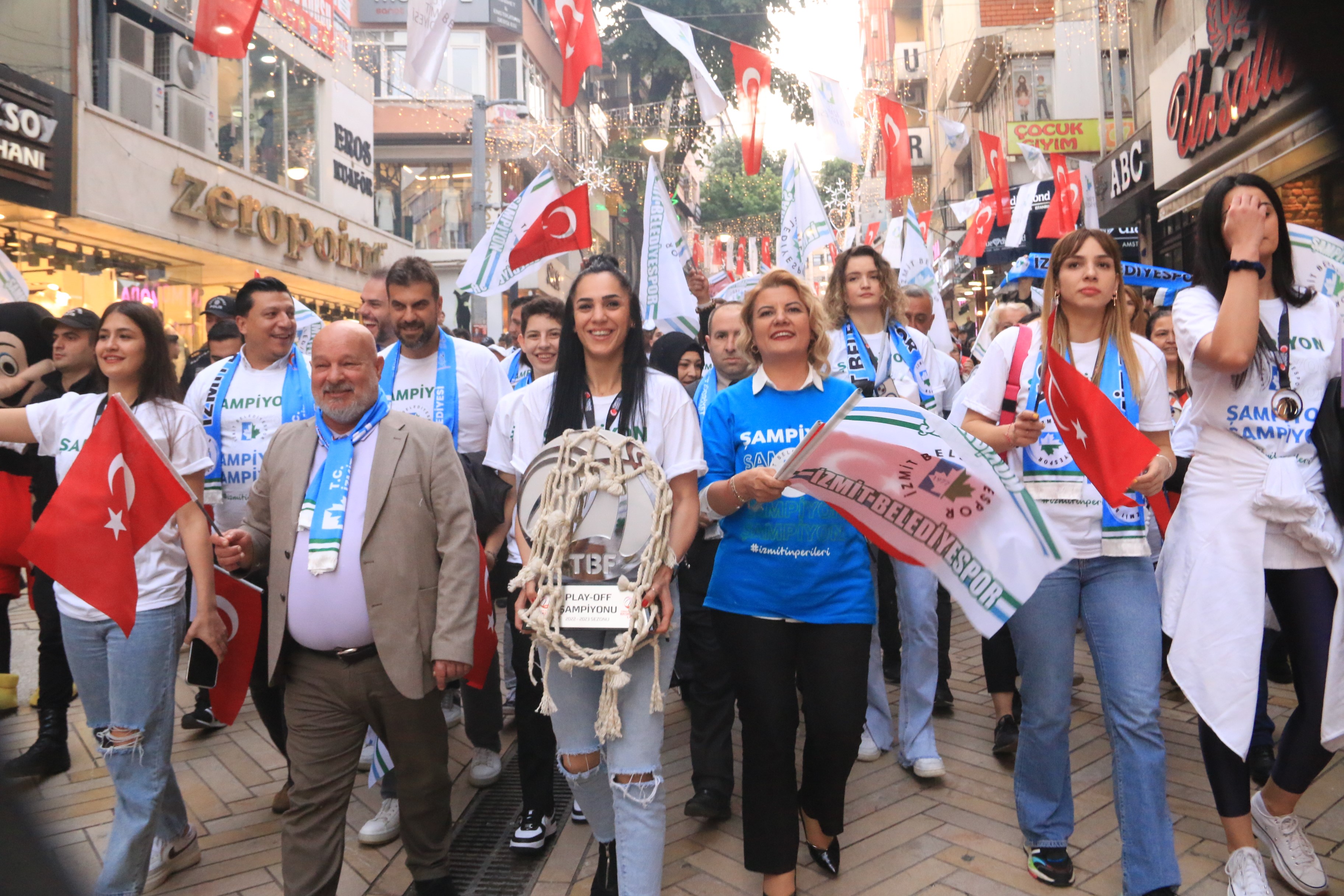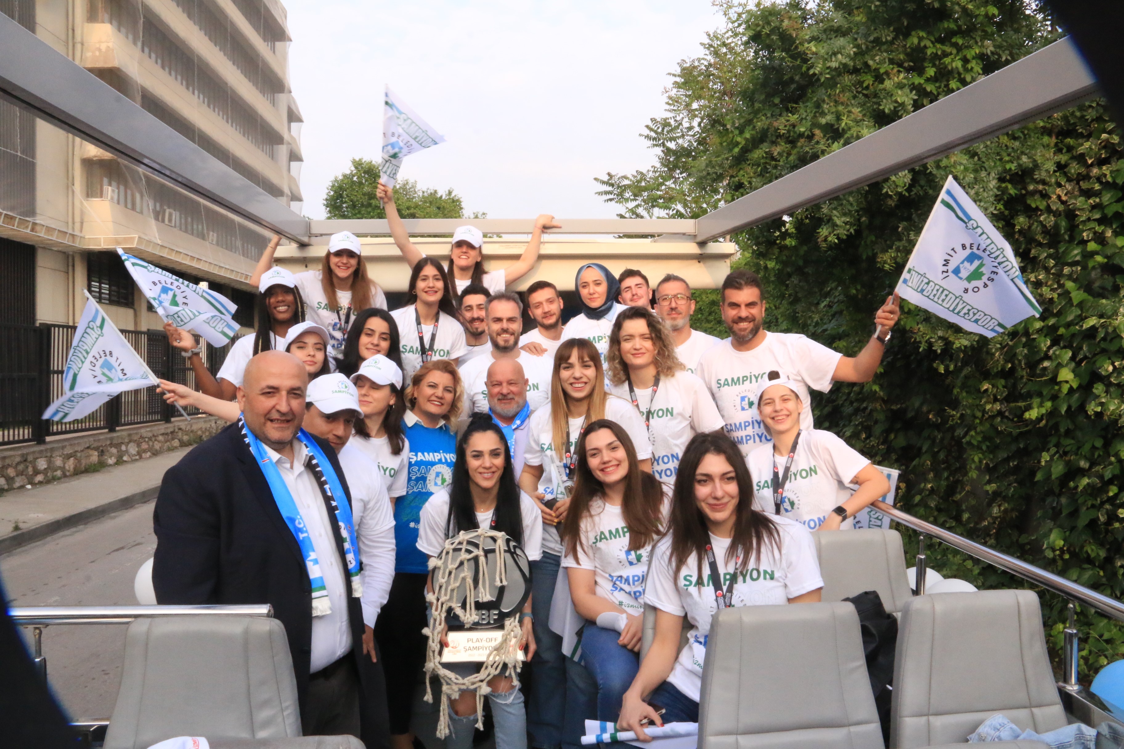 Türkiye Kadınlar Basketbol Ligi’ni play-off şampiyonu olarak tamamlayan ve Süper Lig’e yükselen İzmit Belediyespor şampiyonluğu şehir merkezinde binlerce İzmitli ile birlikte kutladı. Kutlamalar, İzmit Belediye Başkanı Fatma Kaplan Hürriyet, İzmit Belediyespor Kulüp Başkanı Yaşar Kardaş, kulüp yöneticileri, teknik ekip ve sporcuları taşıyan üstü açık otobüsün şehir merkezinden arabalı kortejle geçişiyle başladı.