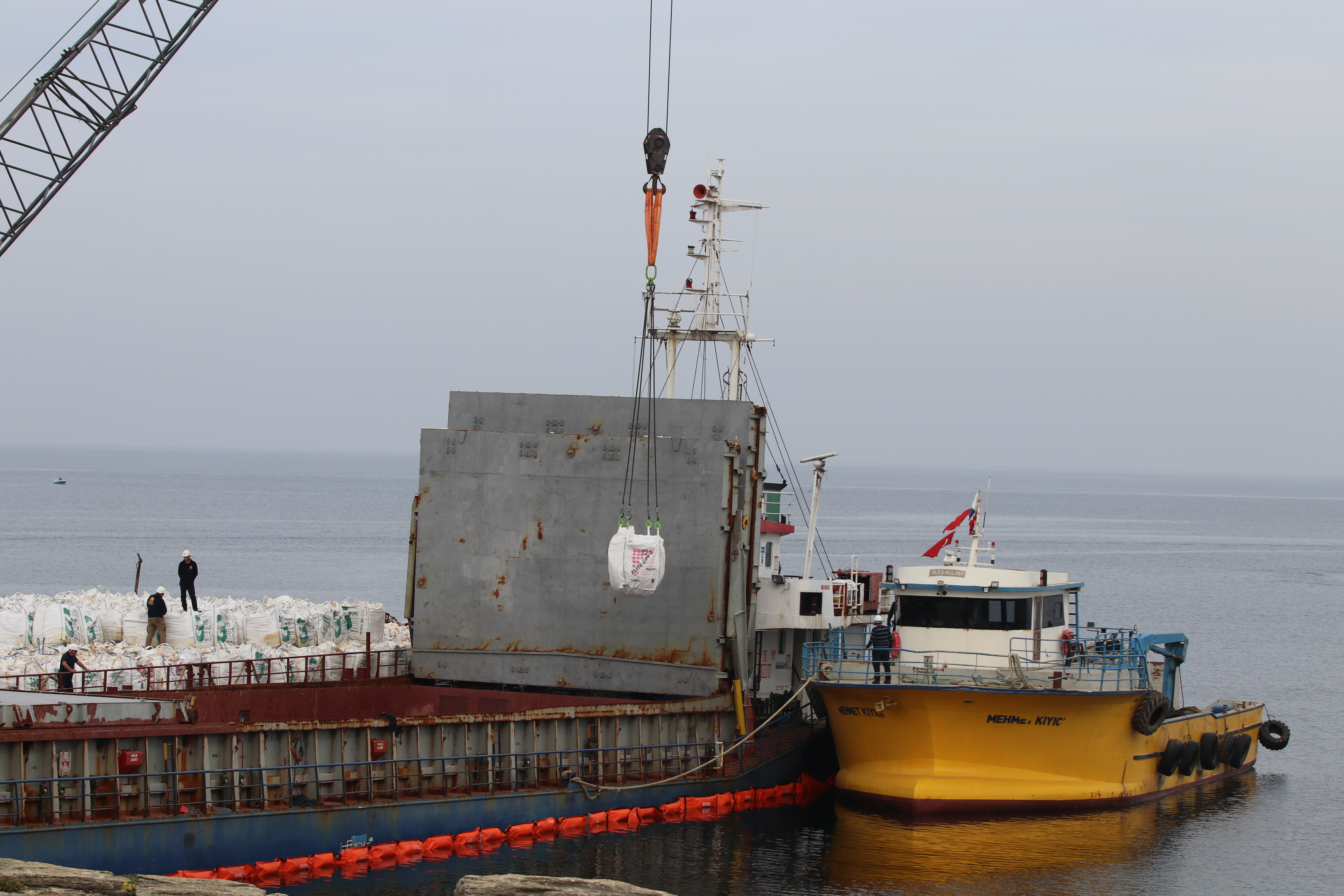 VİNÇ YARDIMIYLA BAŞKA GEMİLERE SEVK EDİLİYOR
