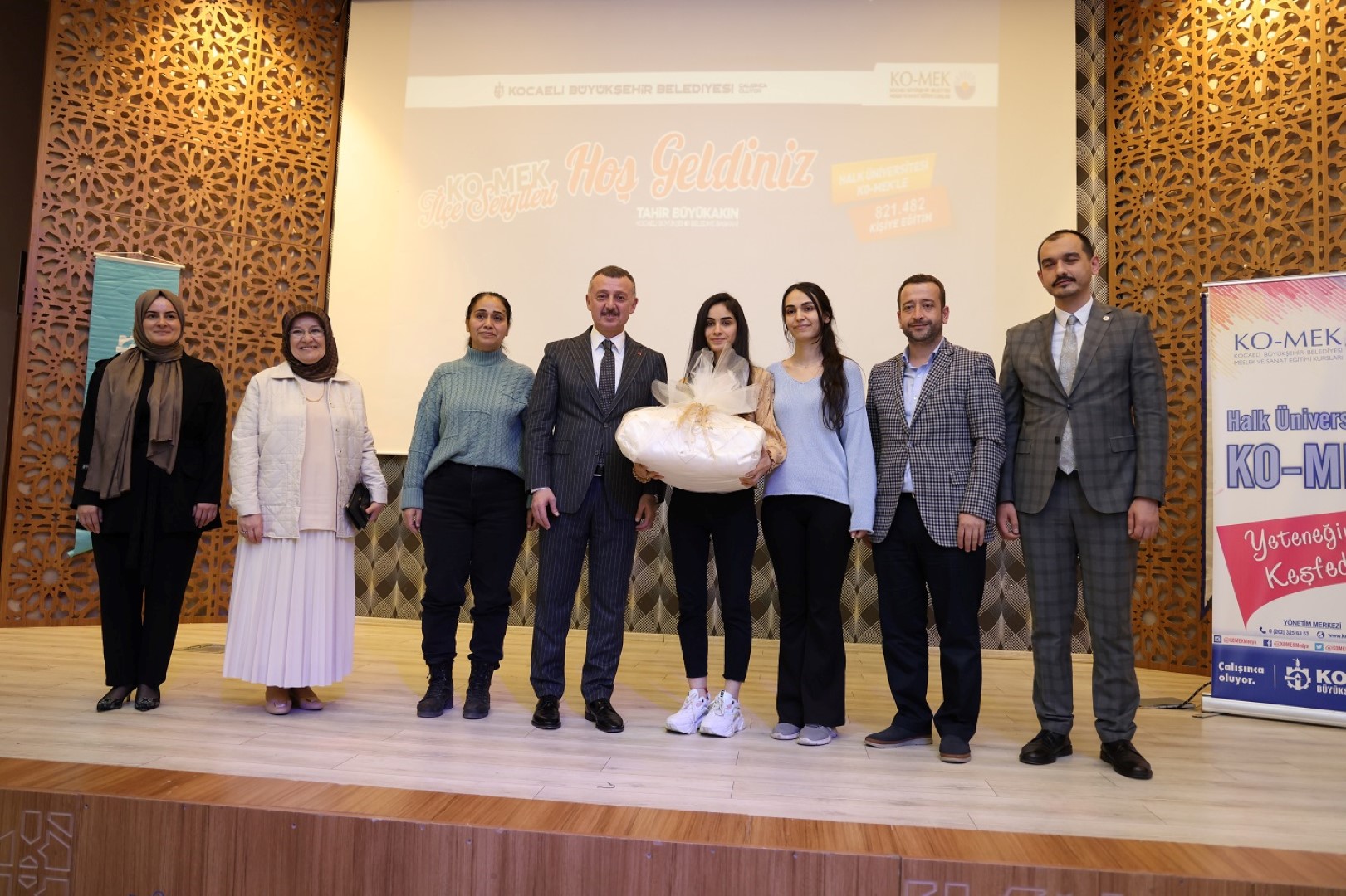 Söyleşinin ardından saygı duruşu ve İstiklal Marşı’nın okunması ile başlayan programda kursiyerler adına Yahya Kaptan Kurs Merkezi takı tasarım kursiyeri Belma Emeksiz konuşma yaptı. Emekli olduktan sonra kendisini boşlukta hissettiğini belirten Emeksiz, “KO-MEK benim için ikinci bir hayat oldu. Burada öğrendiklerimle adeta kendime emeklilik sonrası ikinci meslek edindim. Bize bu imkanı sağlayan Başkanımız Büyükakın’a ve ekip arkadaşlarına çok teşekkür ediyoruz” ifadesini kullandı.
