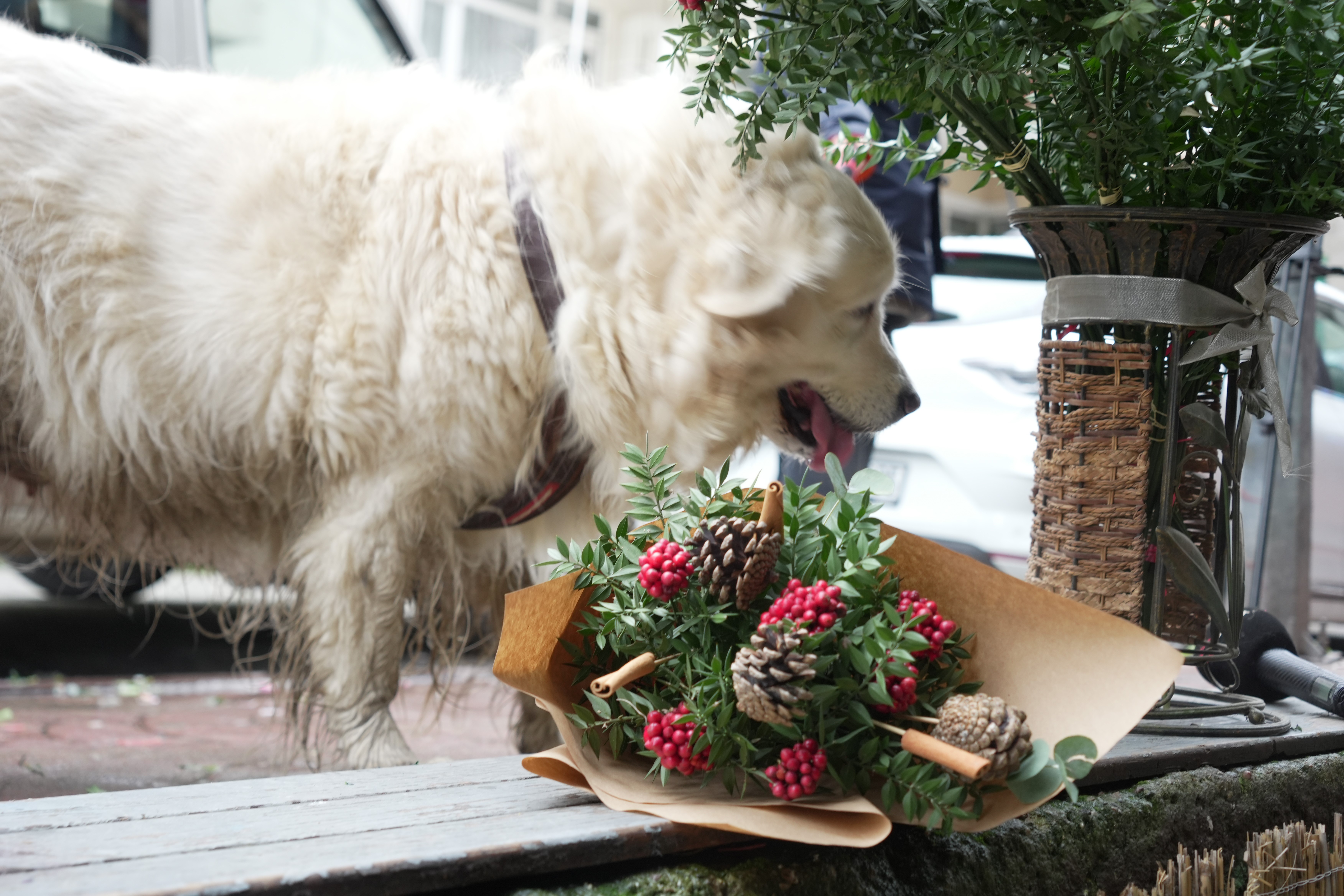 İzmit’te bir çiçekçi dükkanında sipariş için hazırlanan kokina buketi, kurye gelmeden önce sokak köpeği tarafından götürüldü. Güvenlik kameralarına yansıyan sevimli hırsızlık, dükkan sahibini hem şaşırttı hem de güldürdü