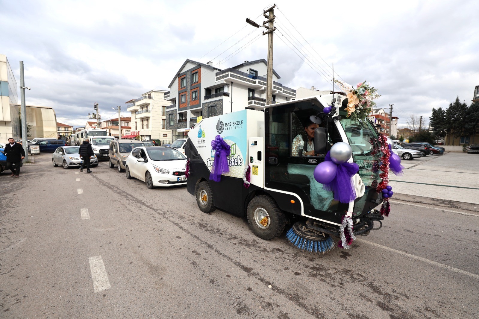 Başiskele’de Türkan Baylan, şoförü olduğu belediyenin mini süpürge aracını gelin arabası yaptı. Süpürge aracındaki gelin ve damadı görenler gözlerine inanamazken, çiftin şehir turu renkli görüntüler oluşturdu