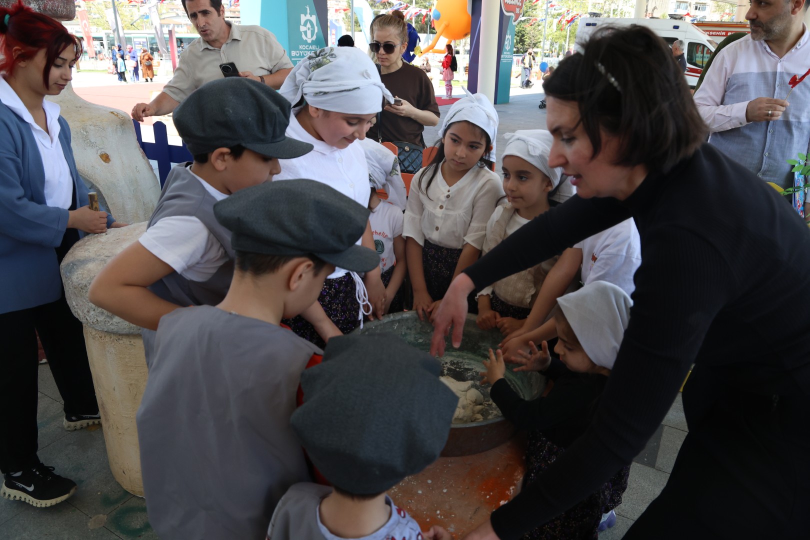 Büyükşehir’in İzmit Milli İrade Meydanı’nda gerçekleştirdiği 23 Nisan Şenliği’nin dikkat çeken noktalarından biri olan “Somuncuklar Etkinlik Alanı”, köy hayatını yansıtan atmosferiyle çocukları geleneksel üretim süreçleriyle buluşturdu. Minikler bu alanda, ekmeğin sofralara ulaşana kadar geçtiği tüm aşamaları uygulamalı olarak öğrendi. Hamurun yoğrulmasından dinlendirilmesine, şekil verilmesinden odun fırınında pişirilmesine kadar uzanan süreç, çocuklar için hem öğretici hem de keyifli bir deneyime dönüştü.
