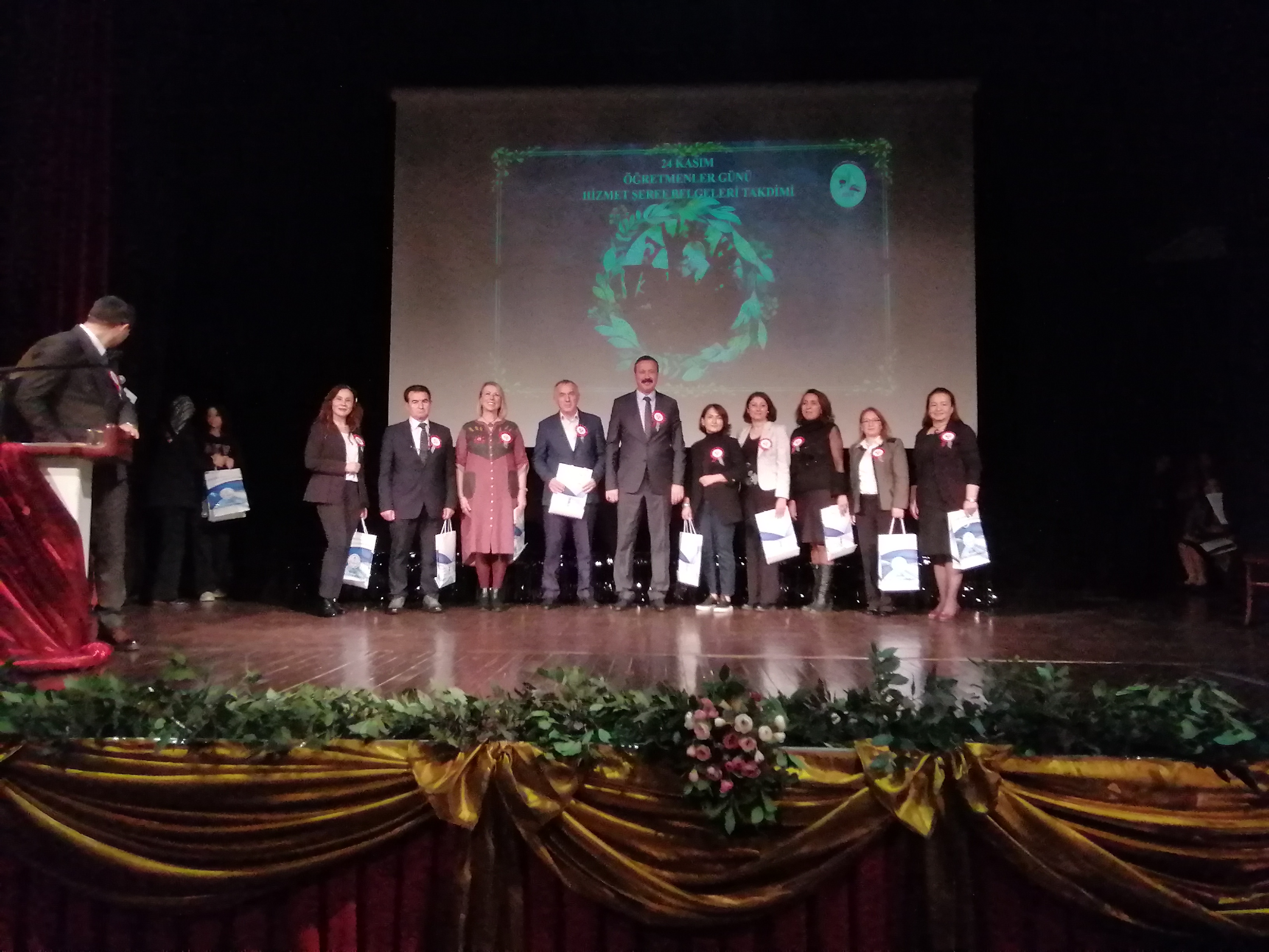 Konuşmaların ardından mesleğe yeni başlayan ve yine meslekten emekli olan birer öğretmen, konuşmalar yaptı. Ardından Öğretmenler Günü dolayısıyla bir öğretmen şiir okudu. Program, Anadolu Kalkınma Vakfı Mesleki ve Teknik Anadolu Lisesi öğrencilerinin hazırladığı sinevizyon gösterisi ile devam etti. Öğretmenler tarafından hazırlanan oratoryonun sunulması sonrasında yine öğretmen ve öğrenciler tarafından mini bir konser verildi. Ardından emekli öğretmenlere, protokol tarafından hizmet şeref belgeleri verildi. Aday öğretmenlik süreçlerini tamamlayan öğretmenlerin yemin töreninin yapılması sonrasında, 24 Kasım Öğretmenler Günü dolayısıyla yapılan ve öğretmenlerin katıldığı yarışmalarda dereceye giren öğretmenlere ödülleri, Kaymakam Gültekin tarafından verildi. Son olarak ilçemizde öğrenciler arasında yapılan Öğretmenler Günü temalı resim, şiir ve kompozisyon yarışmalarında dereceye giren anaokulu, ilkokul, ortaokul ve lise öğrencilerine ödülleri, protokol tarafından verildi. Tören, anı fotoğrafının çekilmesi ile son buldu. Erdem ŞENGÜL