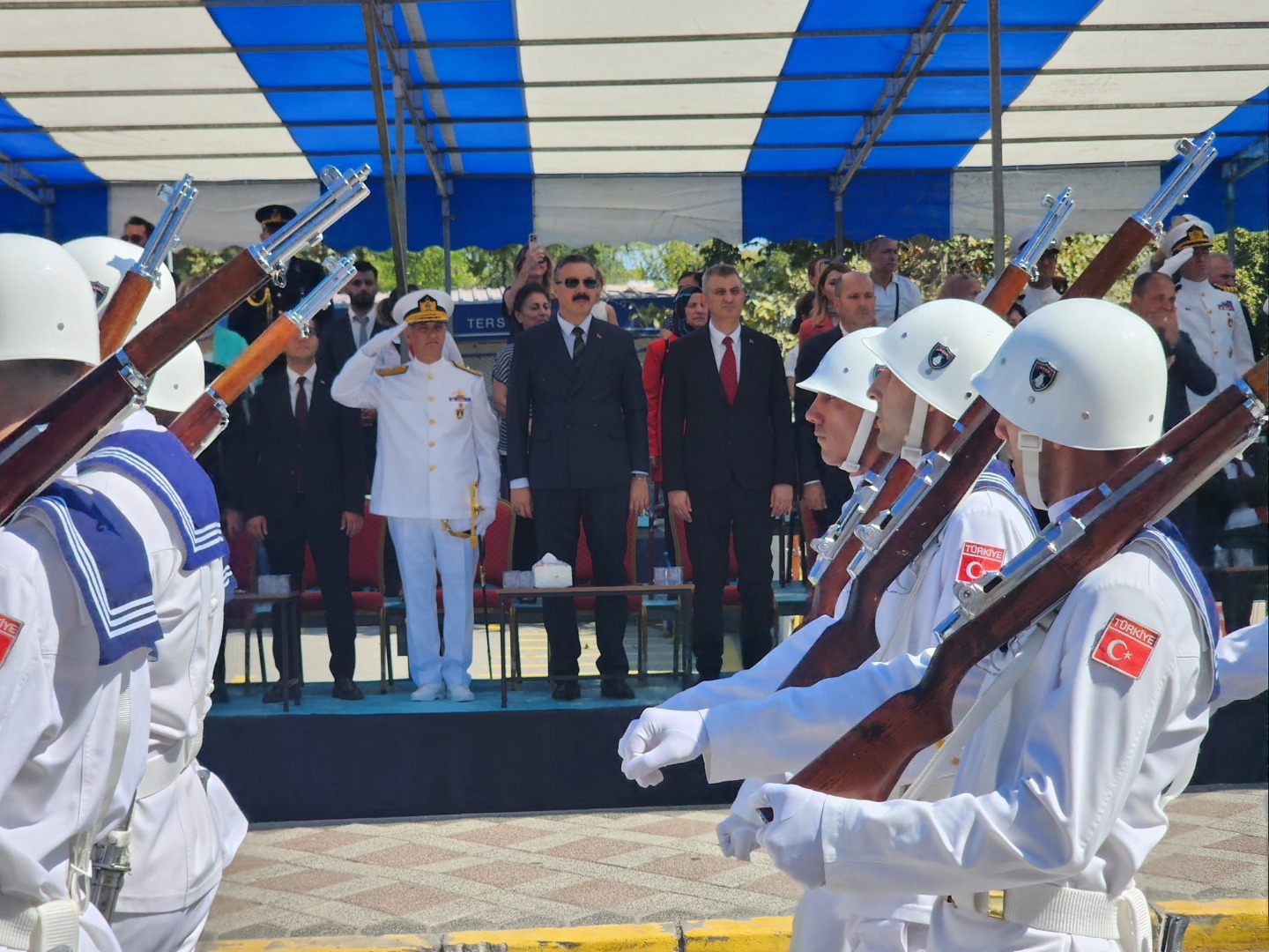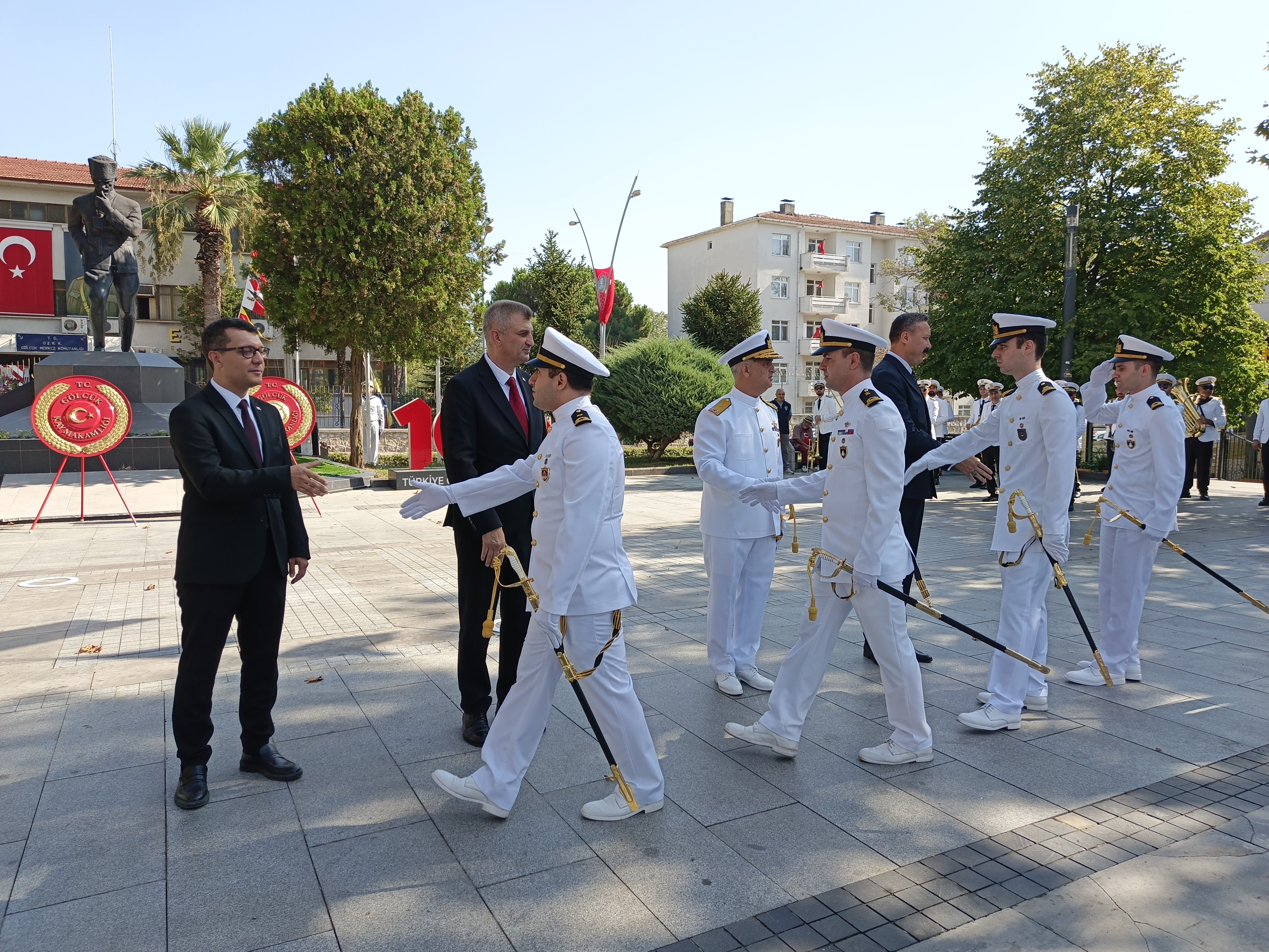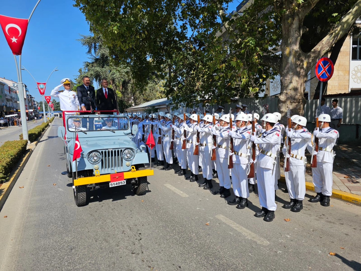 Deniz Binbaşı Karasoy, “Müteakiben Büyük Önder Atatürk’ün ‘Ordular ilk hedefiniz Akdeniz’dir, ileri!’ emriyle ordularımız Ege kıyılarına ulaşarak bağımsızlık mücadelesini büyük bir zaferle taçlandırmıştır. Bu zafer, aynı zamanda yüce Türk Milleti ve onun bağrından çıkmış kahraman ordusunun en zor şartlarda bile hiçbir güce boyun eğmeyeceğini, egemenliği ve özgürlüğü söz konusu olduğunda gücünün yetemediği hiçbir engel tanımayacağının eşsiz bir örneğidir. Yüreğindeki vatan sevgisi, sarsılmaz irade ve üstün cesaretiyle milletini ve ülkesini kanını son damlasına kadar koruyan Türk askeri, bugün de aynı inanç ve kararlılıkla vatanı için canını seve seve feda etmeye hazırdır. Sözlerimi burada sonlandırırken 103 yıl önce özgürlüğün bedelini kanlarıyla ödeyerek bizlere bu güzel yurdu hediye eden başta büyük devlet adamı Ulu Önder Başkomutan Atatürk olmak üzere Kurtuluş Savaşı'nın tüm kahraman şehitlerine Allah'tan rahmet, gazilerimize sonsuz şükranlarımızı sunuyor, bu güzel ve coşkulu bayram gününde Türk Ulusunu bölmek, zayıflatmak veya çökertmek hayalleri kuranlara Atatürk ilkelerine dayalı demokratik ve laik Türkiye Cumhuriyeti’nin ulusal egemenliğinin bölünmez bütünlüğünü bozmaya kimsenin gücünün yetmeyeceğini bir kez daha hatırlatmak istiyoruz. Ne mutlu Türküm diyene!” ifadelerini kullandı.
